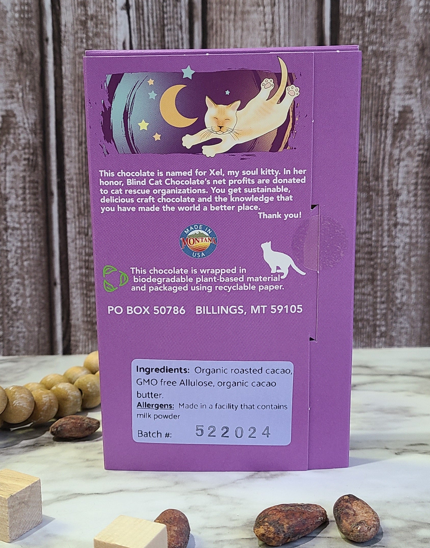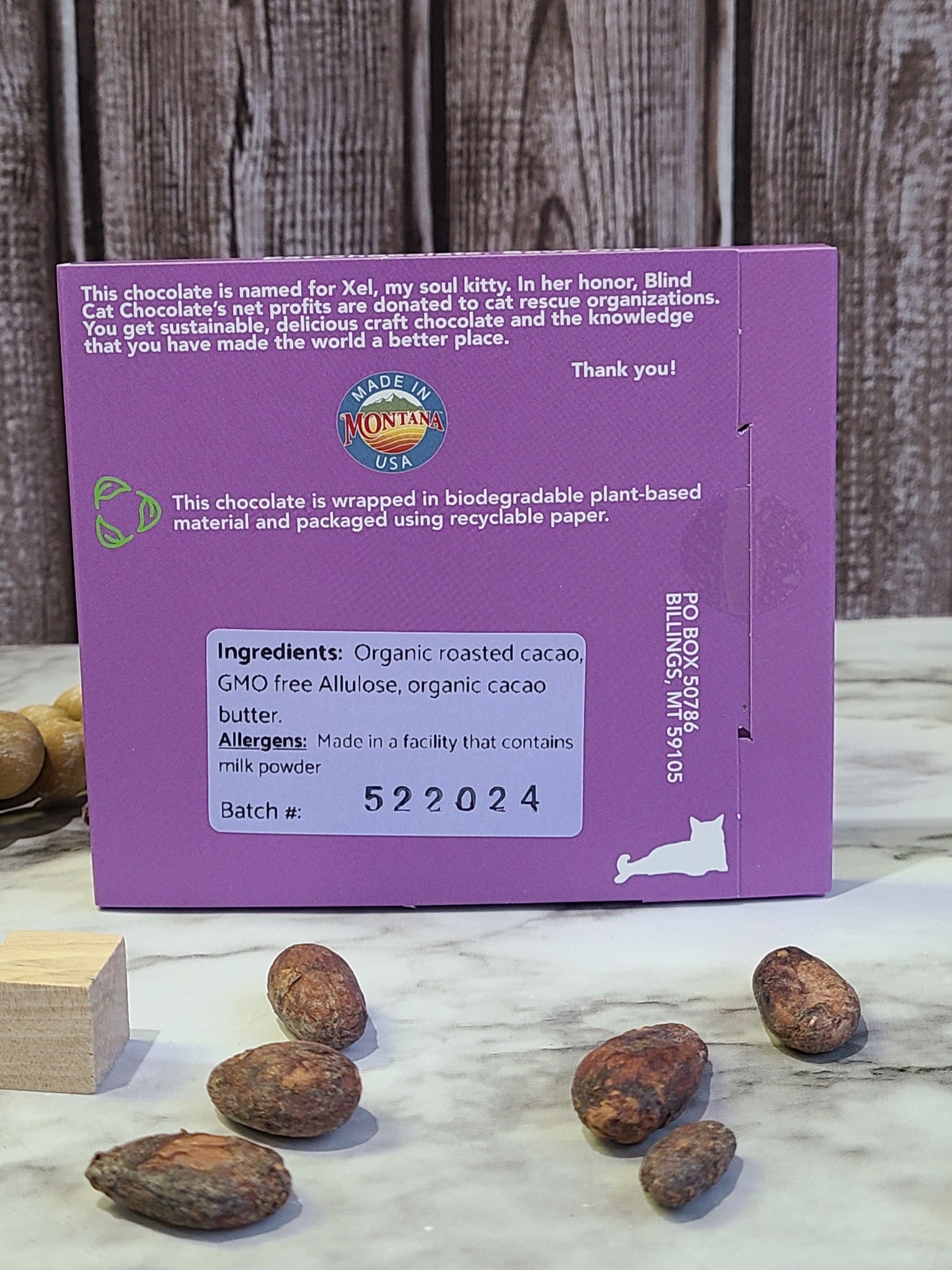 Details: Ingredients: Organic cacao nibs, GMO free allulose, Organic cocoa butter. Allergens: None. Made in a facility that contains milk powder and soy.