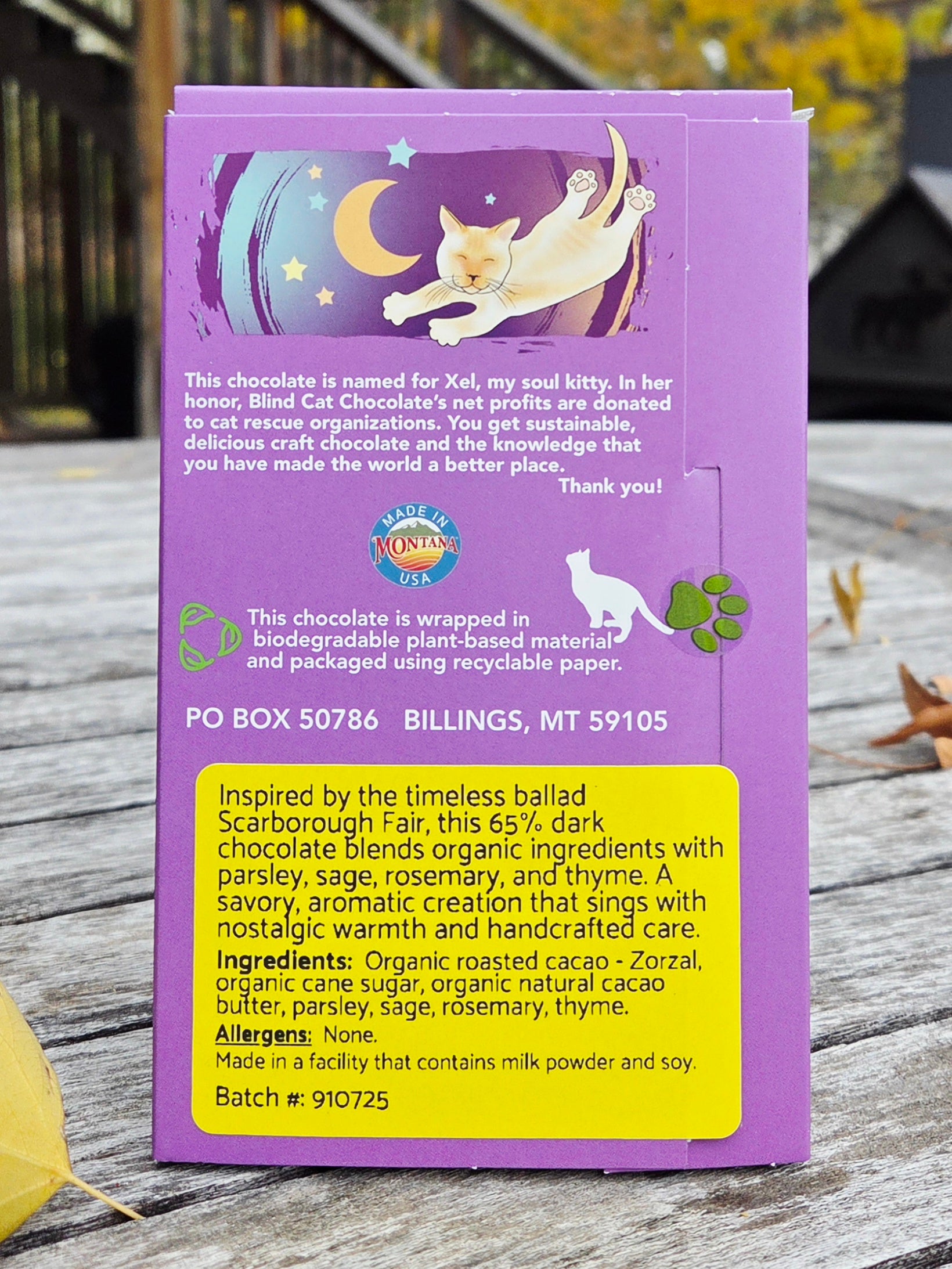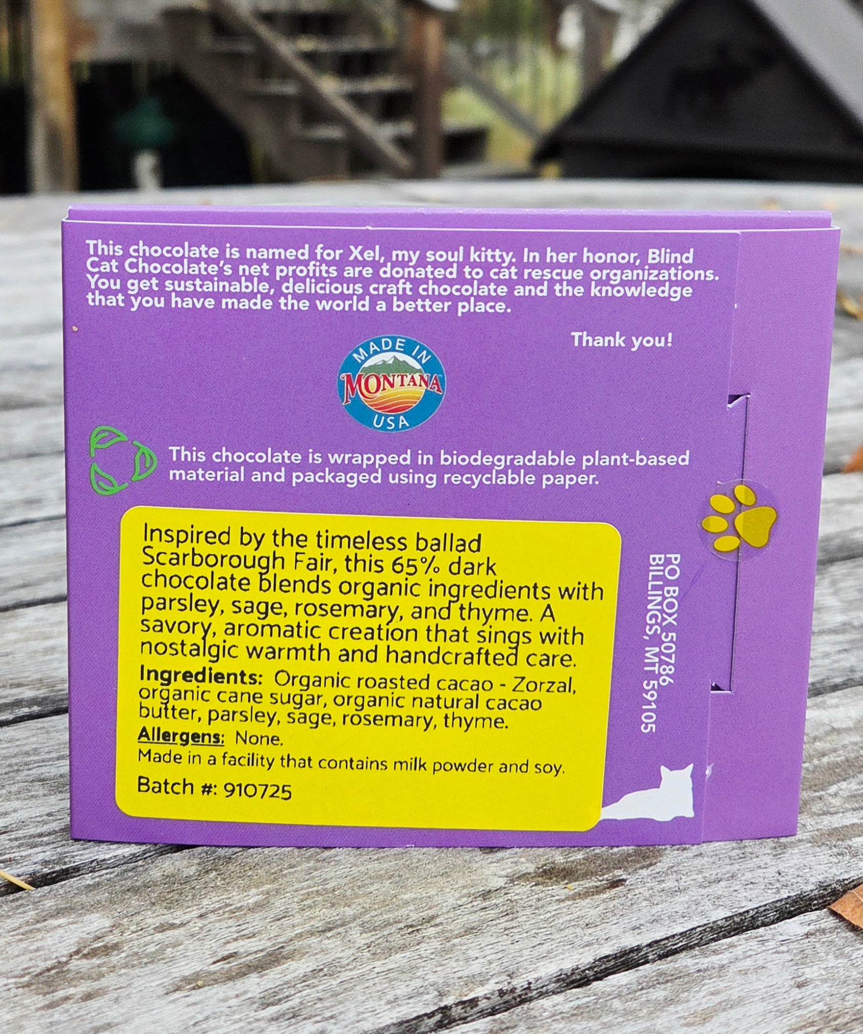 Inspired by the haunting beauty of the classic folk song Scarborough Fair, this small-batch 65% dark chocolate brings the lyrics to life with an elegant twist. Crafted from organic ingredients and infused with the herbs sung through generations—parsley, sage, rosemary, and thyme—each bite is both familiar and unexpected.
