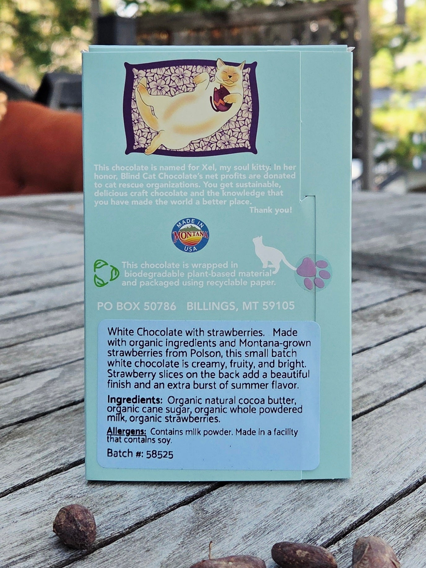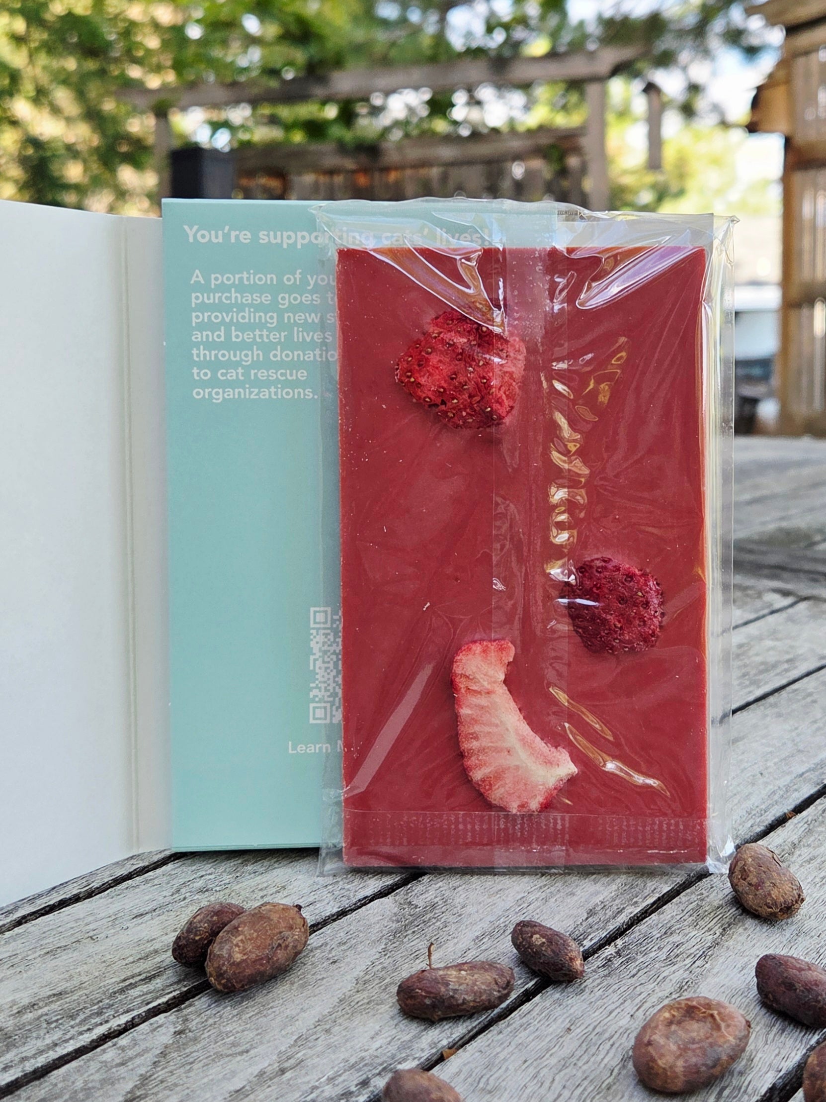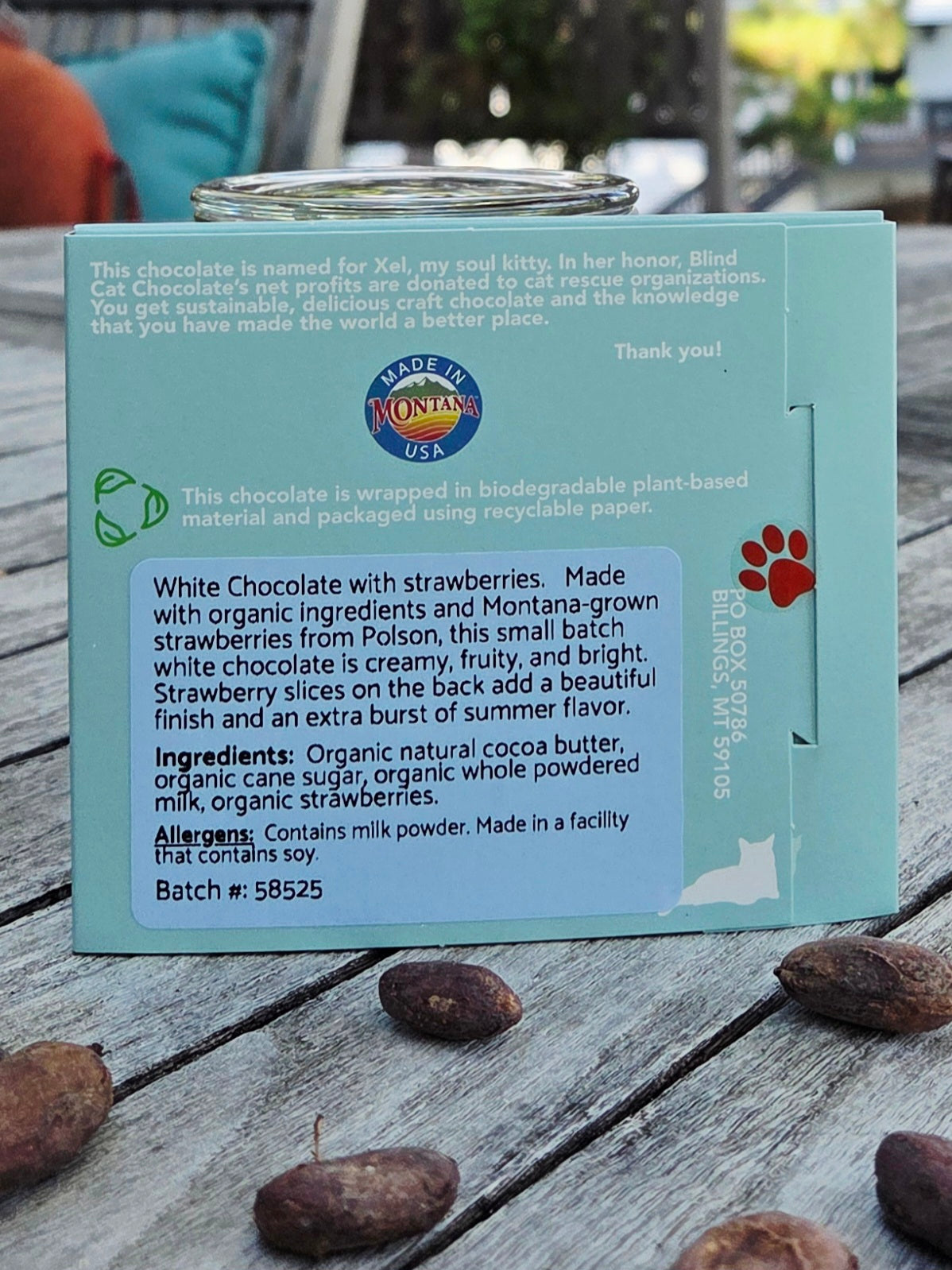 Crafted in small batches with organic ingredients, this bar showcases the simple beauty of Montana’s summer harvest. Sweet strawberries from Polson are blended into our creamy white chocolate, infusing it with a delicate fruitiness. Each bar is finished with slices of dried local strawberries, laid by hand on the back for a stunning finish and an extra burst of berry flavor. A true taste of Montana—bright, creamy, and unforgettable.